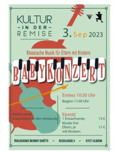 3.September.2023, Sonntag 11 Uhr. Am Sonntag, den 3.9.23 um 11 Uhr (Einlass 10 Uhr 30) kommen als Abschluss unseres Kulturwochenendes „Kultur in der Remise“ die kleinen Zuhörer auf ihre Kosten: Beim Babykonzert können Babys, Geschwisterkinder, Schwangere, Eltern, Großeltern und Freunde gemütlich auf einer Decke sitzen und klassische Musik neu und anders entdecken: Keine schrägen Blicke, …